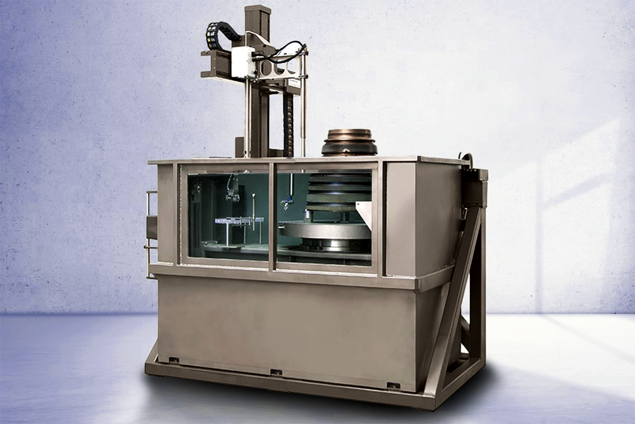 Rotary / Turntable Immersion Systems Servo-driven rotating part positioner combined with linear probe axis — optimised for rotary-symmetrical components where circumferential scan coverage and high throughput are both required. Unique chucking designs accommodate large rotary parts with access to all surfaces. Typical Applications: Forged disks and rings, compressor and turbine rotor stages, shaft sections, cylindrical billets.